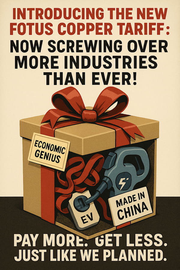 FOTUS looked at the smoldering wreckage of the American economy—held together with duct tape, caffeine, and overworked immigrants—and thought, “You know what this needs? A big, flaming stick of dumb shoved right up the supply chain. Let’s slap a 50% tariff on copper. That’ll fix everything!”