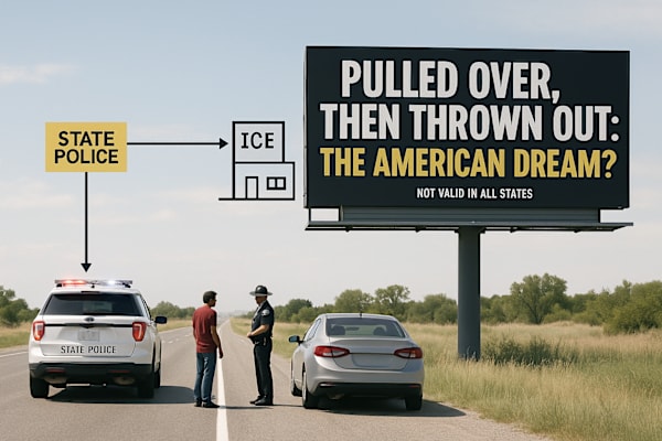 This is a fictional rant in the unmistakable voice of George Carlin. If you think pulling over 19-year-old scholarship students and handing them to ICE is “law and order,” you might be suffering from a severe case of authoritarian bootlicking. Consult your conscience. Side effects may include rage, empathy, and the sudden urge to vote like people’s lives depend on it. Because they do.