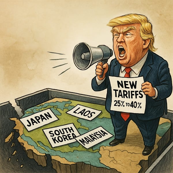 This week’s episode opens with FOTUS discovering the magic of mail merge. That’s right—he sent identical letters, like a goddamn chain email from 2002, to Japan, South Korea, Malaysia, Laos, and whatever other countries he could remember between Diet Coke breaks, saying: “Hi there, you’re invited to an exclusive economic beatdown! Tariffs from 25% to 40%, RSVP by August 1.” Typed. Mailed. Posted. Tanked the markets.