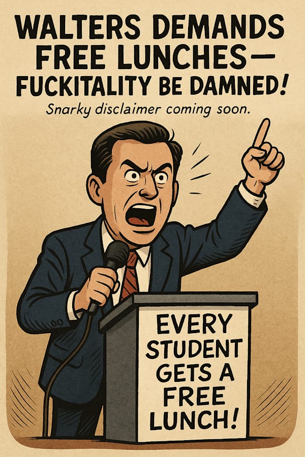 And let’s talk about deadlines. It’s July—no free lunch funding in the pipeline, no federal grants applied for, and the deadline to join federal meal programs has come and gone. But hey, don’t let facts mess with your free lunch fantasy, right? Those programs were for the kids, but apparently Walters thinks PE and school safety are optional.